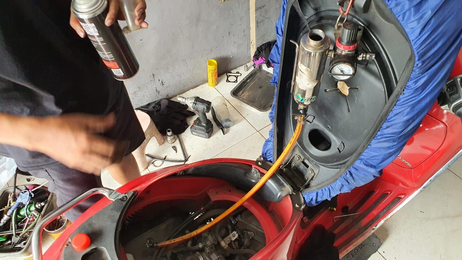- Penggantian slang bahan bakar: Slang bahan bakar yang menghubungkan fuel pump ke injektor diganti dengan slang yang terhubung ke tabung pembersih.