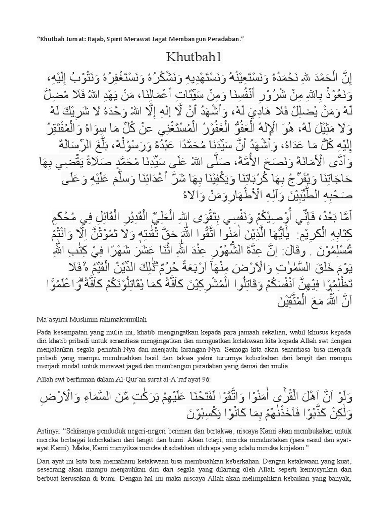 اَلْحَمْدُ للهِ الَّذِى جَعَلَنَا وَاِيَّكُمْ عِبَادِهِ الْمُتَّقِيْنَ وَاَدَّبَنَا بِالْقُرْاَنِ الْكَرِيْمِ. اَشْهَدُ اَنْ لاَ الَهَ اِلاَّ اللهُ وَحْدَهُ لاَ شَرِيْكَ لَهُ. وَاَشْهَدُ اَنَّ مُحَمَّدًا عَبْدُهُ وَرَسُولُهُ. َاللَّهُمَّ صَلِّ وَسَلِّمْ عَلَى مُحَمَّدٍ وَعَلَى اَلِهِ وَصَحْبِهِ اَجْمَعِيْنَ اَمَّا بَعْدُ : فَيَا اَيُّهَا النَّا سُ اتَّقُوا اللهَ حَقَّ تُقَاتِهِ وَلاَ تَمُوتُنَّ اِلاَّ وَاَنْتُمْ مُسْلِمُونَ