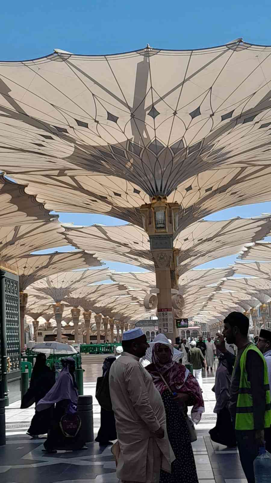 Saya browsing sebentar mencari info jam berapa biasanya payung dibuka. Sekitar 05.30 — 06.00. Masih beberapa saat. Saya sedikit tidak sabar dan membatalkan menunggu payung dibuka. Baru saja saya hendak beranjak, tiba-tiba payung terbuka perlahan. MaasyaAllah, cantik. Segera saya abadikan momen itu. Membutuhkan waktu 3 menit bagi setiap payung untuk terbuka sempurna. Setelah puas mendapat momen terbukanya payung, saya masuk masjid dari pintu 16 favorit saya. Di sana saya juga bersalawat, kali ini sambil menunggu kubah coklat dibuka.