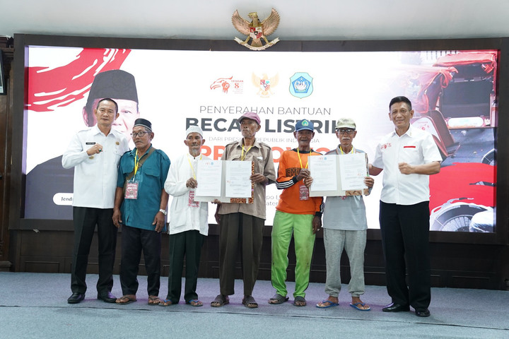 Sejumlah penarik becak lansia hadir di Pendopo Lokatantra, Kabupaten Lamongan. Mereka duduk rapi dan siap menerima 200 unit becak listrik yang diberikan oleh Presiden RI Prabowo Subianto. Bantuan ini tidak hanya menjadi bentuk dukungan, tetapi juga menjadi sarana penting untuk menopang kehidupan para penarik becak di usia senja.