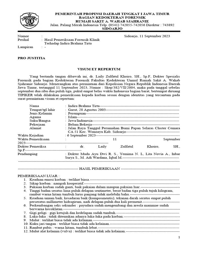 Satreskrim Polres Jepara bahkan sudah mengantongi hasil pemeriksaan visum et repertum (VeR) korban sebagai salah satu alat bukti. Kasatreskrim Polres Jepara, AKP M. Faizal Wildan Umar Rela menerangkan, setelah hasil visum didapatkan, selanjutnya tim penyidik melakukan pemeriksaan terhadap dokter yang mengeluarkan VeR. Kata dia, perkembangan kasus tersebut segera naik ke tahap penyidikan setelah terkumpul bukti-bukti yang cukup.