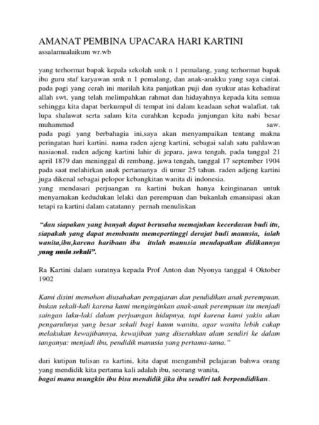 10 Contoh Amanat Pembina Upacara Hari Kartini 2026, Singkat dan Bermakna