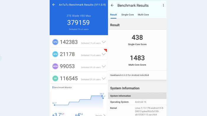 Dalam pengujian menggunakan AnTuTu, perangkat ini mencatatkan skor 379.159 poin. Sementara pada pengujian Geekbench, skor single-core dan multi-core menunjukkan performa yang kompetitif di kelasnya. Saat digunakan memainkan gim seperti PUBG Mobile dan Asphalt 9: Legends, performanya masih nyaman. Namun saat mencoba Call of Duty, terasa sedikit penurunan responsivitas pada refresh rate layar.