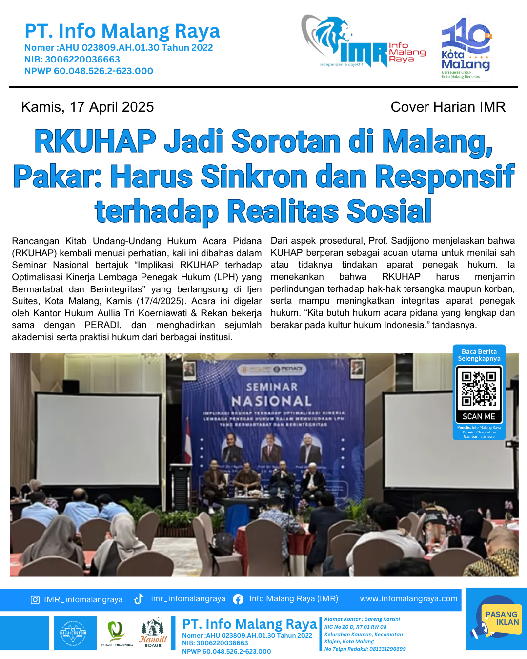 Info Malang Raya – Rancangan Kitab Undang-Undang Hukum Acara Pidana (RKUHAP) kembali menuai perhatian, kali ini dibahas dalam Seminar Nasional bertajuk “Implikasi RKUHAP terhadap Optimalisasi Kinerja Lembaga Penegak Hukum (LPH) yang Bermartabat dan Berintegritas” yang berlangsung di Ijen Suites, Kota Malang, Kamis (17/4/2025). Acara ini digelar oleh Kantor Hukum Aullia Tri Koerniawati & Rekan bekerja sama dengan PERADI, dan menghadirkan sejumlah akademisi serta praktisi hukum dari berbagai institusi.