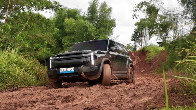 Pengujian berlanjut ke jalur tanah yang licin setelah diguyur hujan. Dalam kondisi ini, sistem penggerak empat roda dan pilihan mode berkendara mulai menunjukkan perannya.