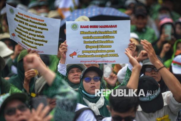 Sejumlah guru madrasah swasta melakukan aksi damai di depan Kompleks Parlemen, Senayan, Jakarta, Rabu (11/2/2026). Aksi yang diikuti guru madrasah swasta dari berbagai daerah tersebut menuntut DPR mendorong kebijakan yang menjamin tidak adanya diskriminasi terhadap guru madrasah swasta dalam berbagai aspek, termasuk kesejahteraan dan perlindungan profesi. Aksi damai ini menjadi momentum bersama untuk memperjuangkan keadilan, pengakuan, serta peningkatan kesejahteraan guru madrasah swasta di seluruh Indonesia.