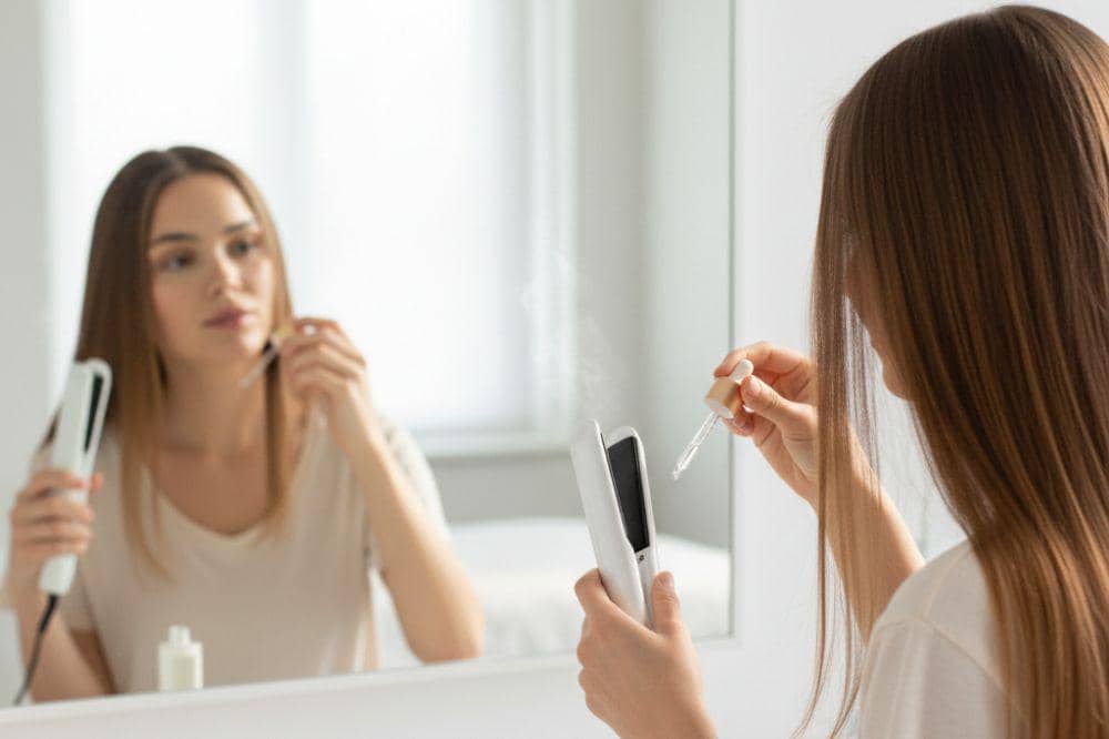 Hair serum juga berfungsi sebagai pelindung panas. Jika Mama sering menggunakan hair dryer, catokan, atau curling iron, aplikasikan serum sebelum styling untuk membentuk lapisan pelindung pada batang rambut. Lapisan ini membantu mengurangi kerusakan akibat suhu tinggi dan menjaga rambut tetap sehat.