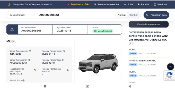 Pihak yang mendaftarkan paten tersebut adalah SAIC GM Wuling Automobile Co., Ltd dengan kategori kendaraan bermotor. Tercantum dalam katalog desain industri nomor A00202508361 sejak 18 Desember 2025 dan masa publikasi 14 Januari 2026.